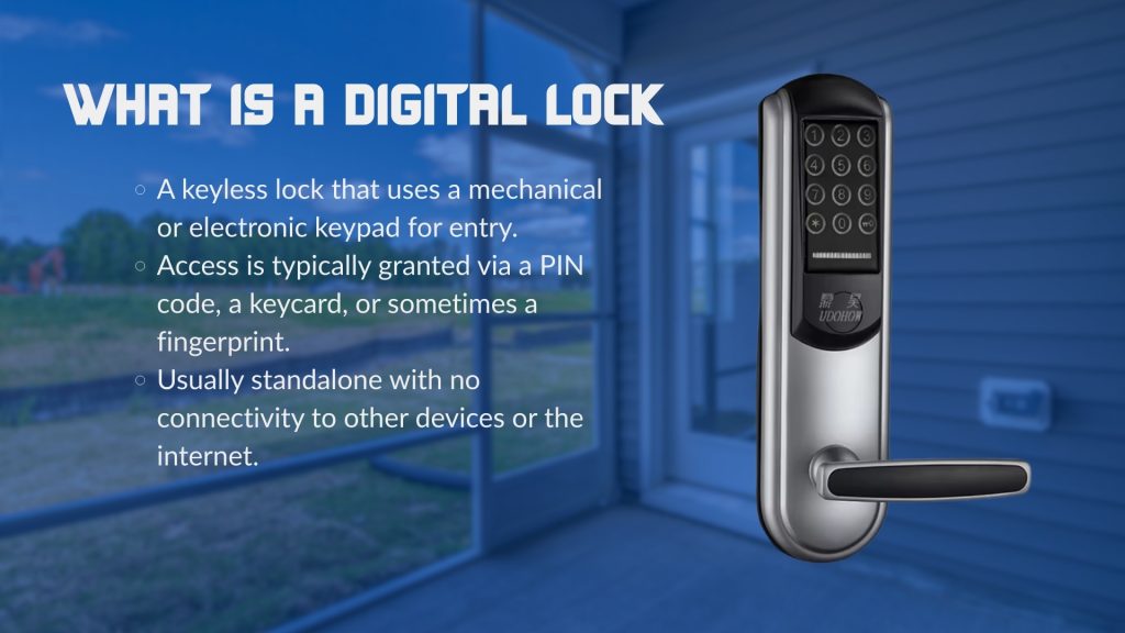 A Digital Door Lock (or electronic keypad lock) replaces your traditional key with a PIN code, keycard, or fingerprint. The crucial point is that you must be physically at the door to use it. It offers keyless entry, but not remote access.